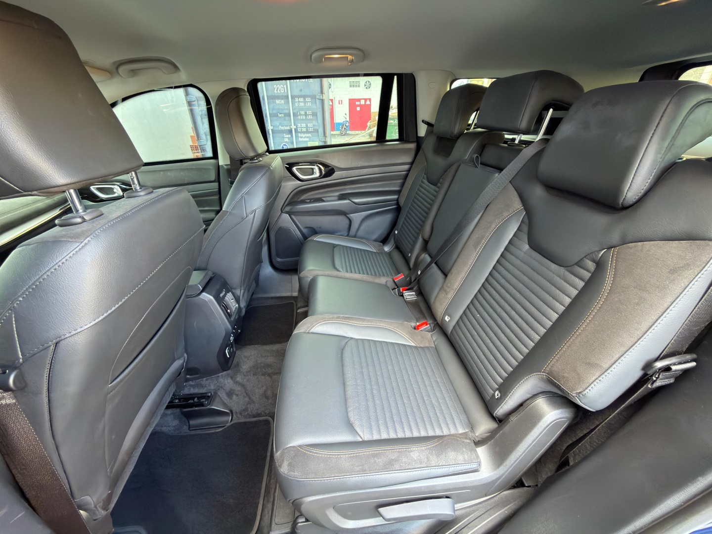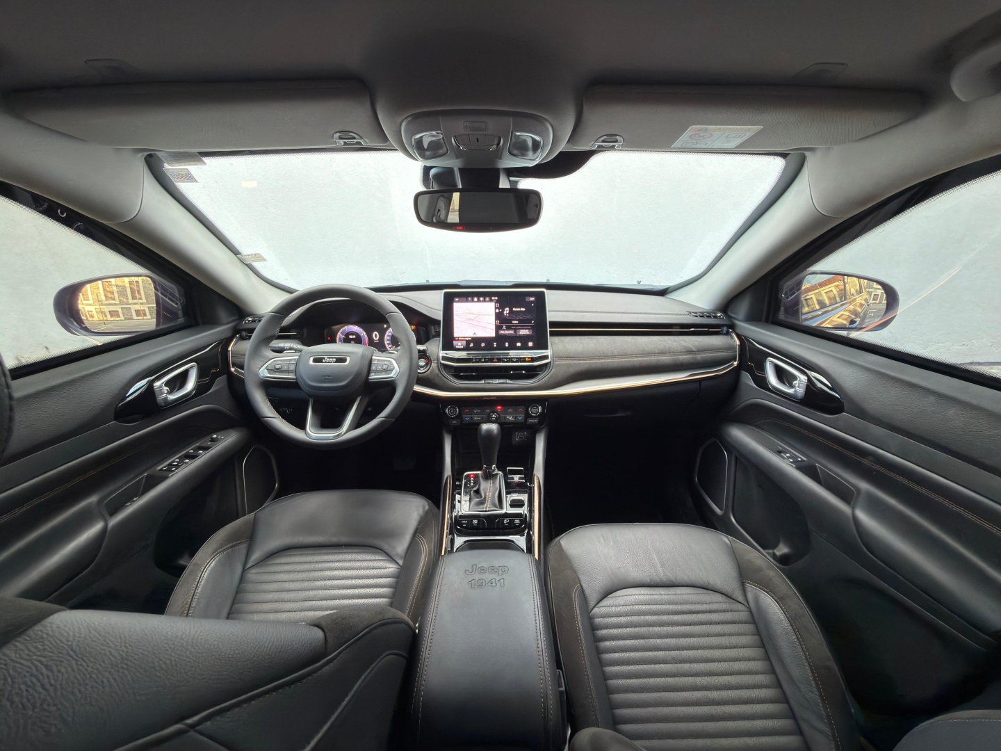 Bancos em Suede e Couro Marrom: Com costuras exclusivas e logo Jeep no encosto.